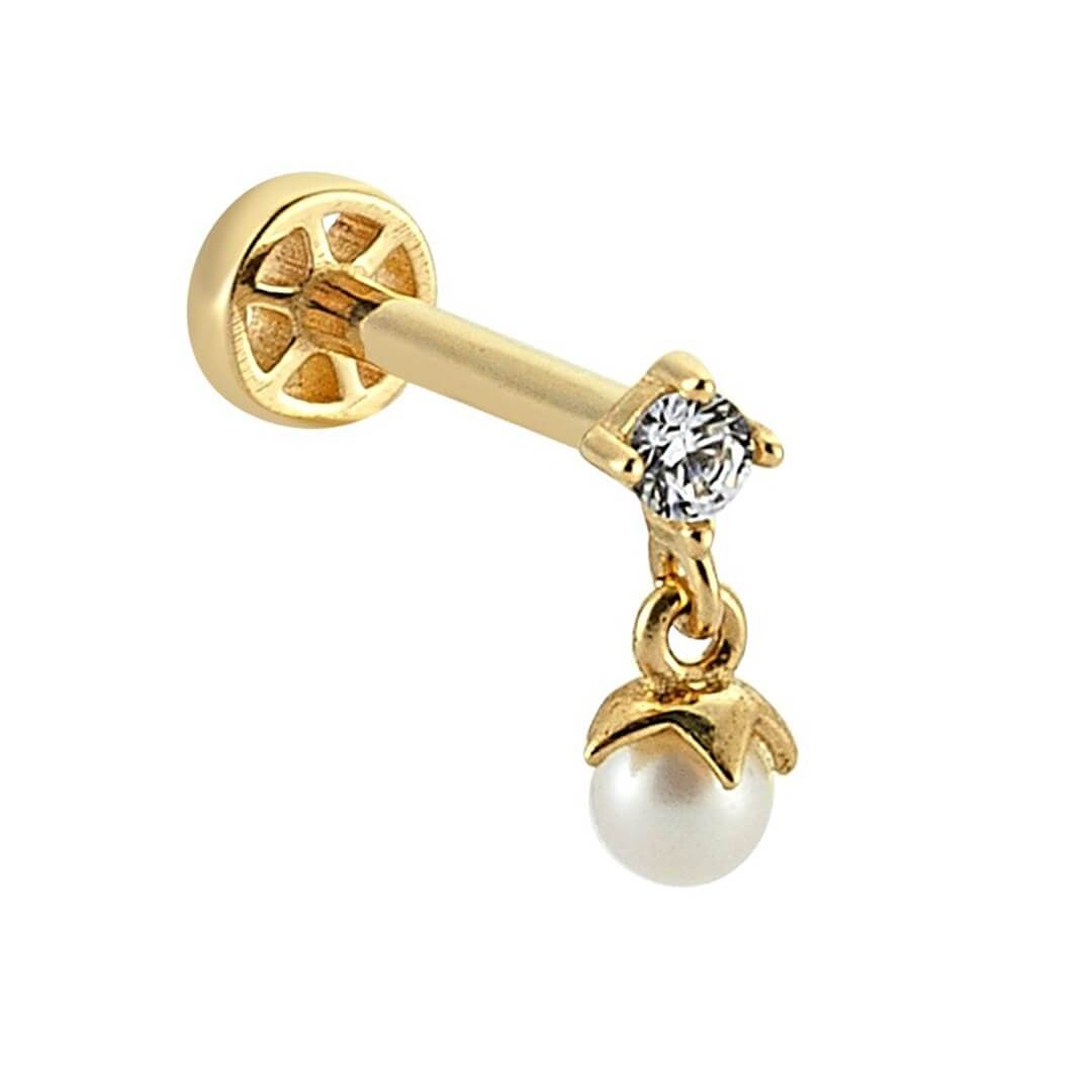 Tragus Altın Piercing – Tek Taşlı İnci Sallantılı (PGP0273)