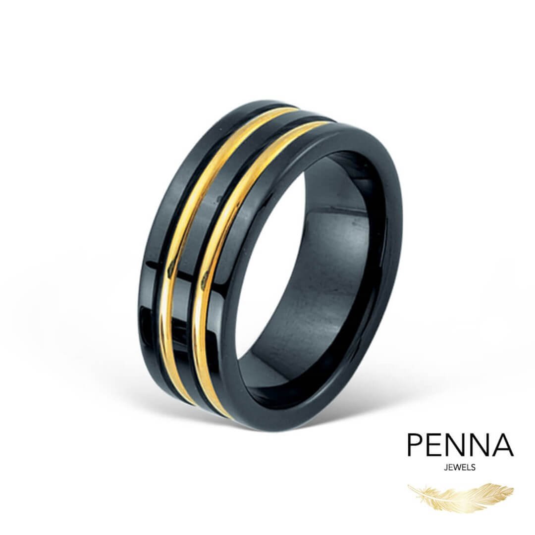 Alyans seçiminde farklılık ve modernlik arayanlar için, Özel tasarım siyah seramik 2 sıra altın şeritli Ceramica Yüzük
